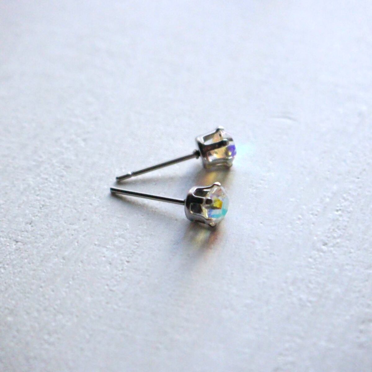 透明なガラスの表面にオーロラ色加工がされたヴィンテージのガラスと、立て爪デザインのひとつぶピアスです。