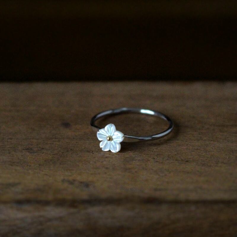 白蝶貝を彫刻して作られた白桜が美しいリングです。芯にゴールドカラーの小さなメタルパーツを使い、シェルの上品な雰囲気をいかしました。